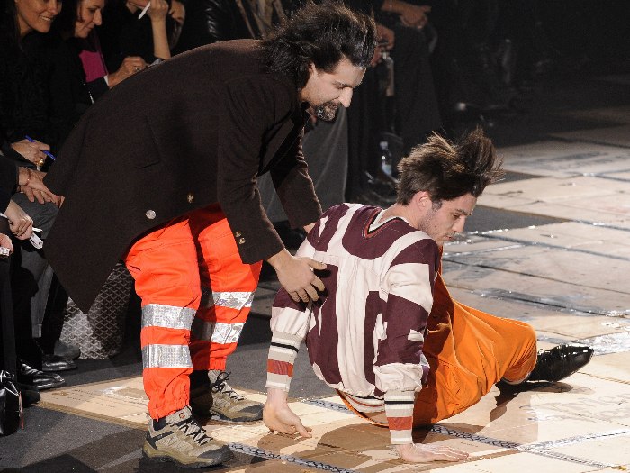 Leitores, leitores é, A melhor parte vem agora arara ! rs. A cara que o estilista faz de tédio de quem quer morrer por causa da modelo (O) caiu na passarela e estragou tudo que bafoo. A foto está logo em baixo.